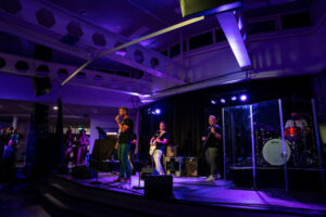 Even verderop is een groepje jongens van dezelfde leeftijd op zoek naar meneer Arts. ‘Dat was echt een toffe mentor’ vinden ze. ‘Hopelijk is hij er vanavond ook.’ Dan klinkt er opeens veel geluid vanuit de bomvolle aula waar de docentenband is aangetreden. Vol verve zetten zij samen met zangeressen mevrouw Van der Sterre en mevrouw Groenen een spetterend optreden neer. Ook meneer Leermakers van wiskunde laat van zich horen. Extra leuk is de reünie van oud BLACK-leden.
