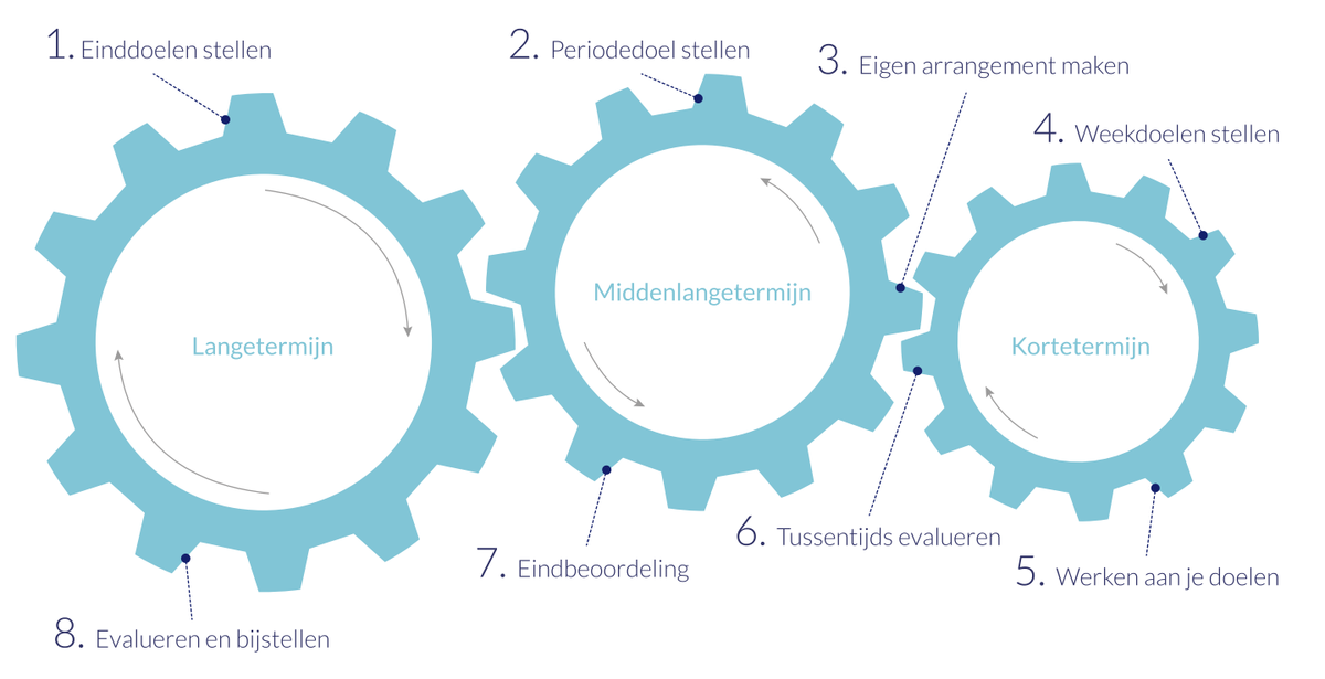 - Weekdoelen stellen: Samen met de coach en/of de vakdocent maakt de leerling zijn eigen planning. Aan welke leerdoelen werk ik wanneer?